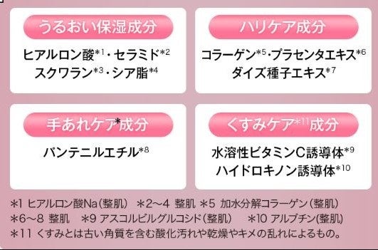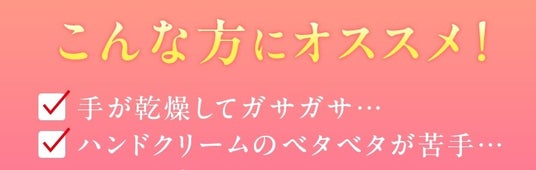 POINT 1 :ハンドパック処方で美容成分を閉じ込めて浸透*ケア美容液にも使われる美容成分と手あれ防止成分を配合。ハンドパック処方で成分がしっかり浸透*²されるよう開発されています。年齢による手の悩みをケアしてハリのあるなめらかな手に導きます。 *角質層まで