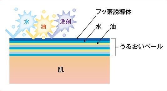 うるおいベールが何層にも重なり、水などの外的刺激から手肌を守ります。長時間うるおいが長続きするので、何回も塗り直す必要がありません。(使用環境により個人差があります)