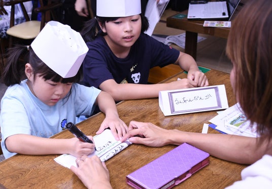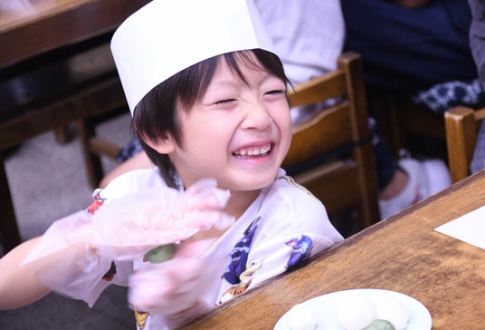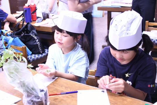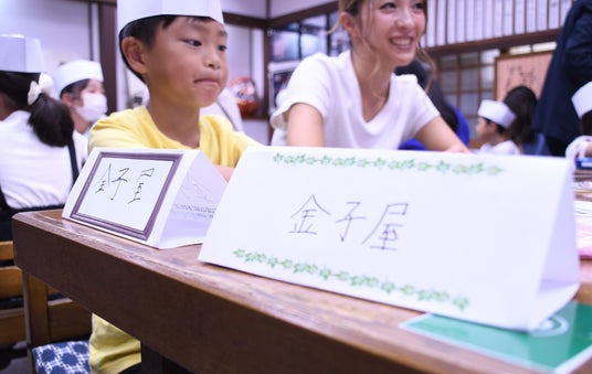 子どもたちは調理帽を被り、草だんご屋の一日店長として店名を考えることからスタート!店名が決まったら各々のテーブルに看板を設置し、草だんごや柴又の歴史についてクイズ形式で学びます。