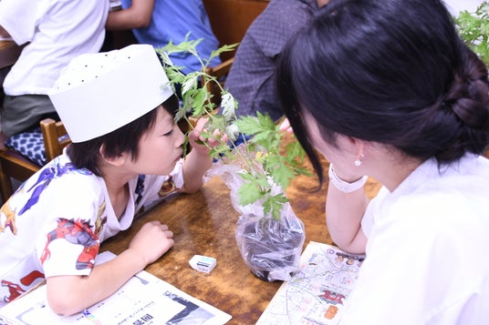 クイズの途中ではポットに入った実物のよもぎが各テーブルに置かれ、ちぎった葉を手で揉み匂いを嗅ぐ子どもたちからは、「良い香り」、「昔飲んだ薬の匂いがする」なんて感想も!