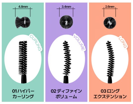 Point3. 仕上がり別ブラシ設計「カール・ボリューム・ロング」の3タイプのブラシで、理想のまつげを自在に演出。