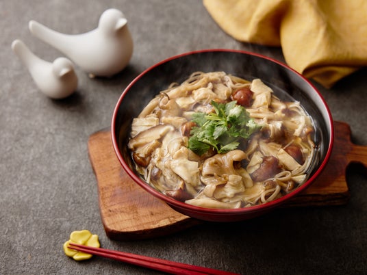 カフェでは「湯葉きのこあんかけ蕎麦」を提供します。二種の湯葉ときのこが入った、こだわりの十割蕎麦です。
