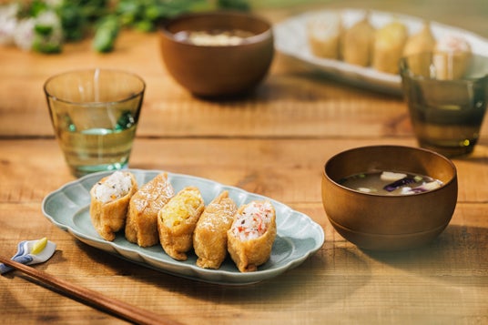 黒ゴマ、わさび、五目、梅ちりめん、カレーの5種の味をセットにしたいなり寿司です。