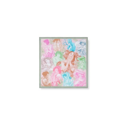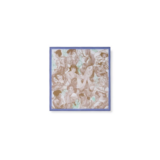 ミュシャの12か月の絵葉書に登場する女性の姿をあしらい、ポップな雰囲気に仕上げたハンカチ。薄手のコットンを100%使用し、軽やかな手触りがポイントです。