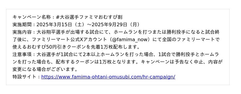 ファミリーマートでは、大谷選手がホームランを打つと、試合終了後にファミリーマート公式Xアカウント@famima_nowにて、おむすび全品に使える50円引きクーポンを先着1万名様にプレゼントしており、これまで通算42万枚を配布いたしました。