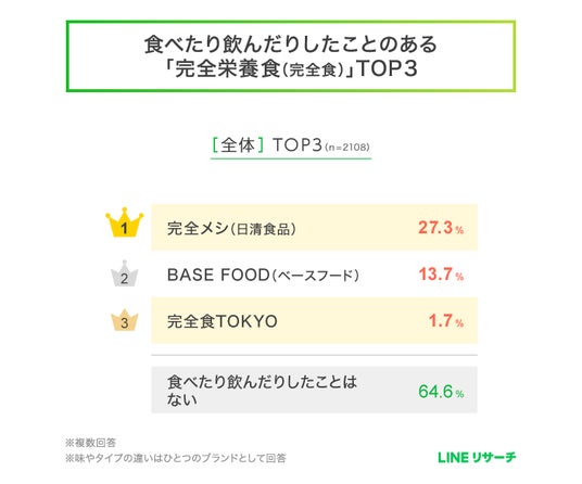 LINEリサーチ、全国の18~59歳の男女を対象に、「完全栄養食(完全食)」に関する調査を実施