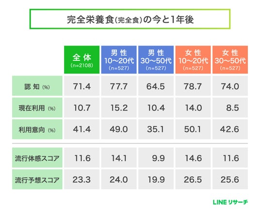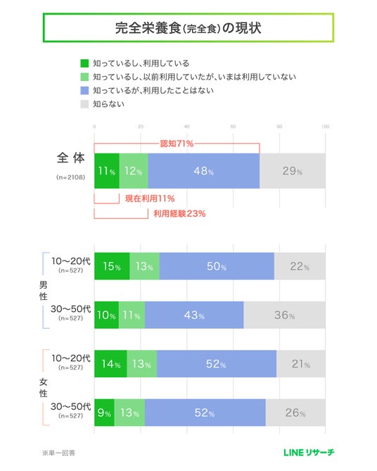【LINEリサーチ】完全栄養食(完全食)の認知率は71%で前回から17ポイント増加。利用意向のある人は全体の41%、現在利用率は11%