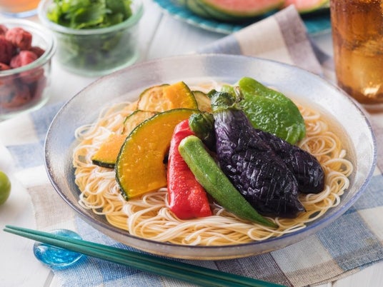 そうめんの魅力は、アレンジがしやすく冷蔵庫のありもので簡単に1食が完成すること。ツナ缶やトマト、ハムや温泉卵などを加えることで、栄養バランスも整い、子どもも飽きずに食べられます。
