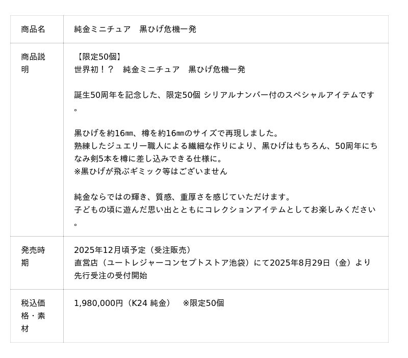 株式会社ユートレジャー(本社:東京都新宿区、代表取締役社長:青木 興一、株式会社ケイ・ウノの連結子会社)は、50周年を迎えたロングセラーパーティーゲーム「黒ひげ危機一発」(発売元:株式会社タカラトミー)とコラボレーションした世界初「純金ミニチュア 黒ひげ危機一発」の受注受付を2025年12月頃より開始いたします。