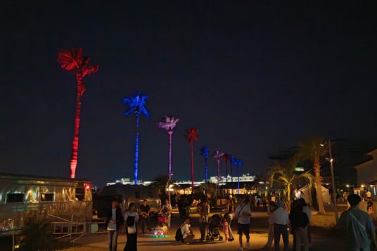 今年は2025年大阪・関西万博の開催を記念し、レッド・ブルー・ホワイトを基調とした万博カラーの特別仕様で演出。例年を上回る本数のヤシの木が光に包まれ、訪れた方々を幻想的な世界へと誘いました。