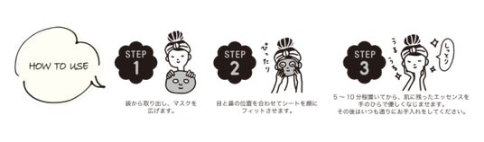 1.袋から取り出し、マスクを広げます。2.目と鼻の位置を合わせてシートを顔にフィットさせます。