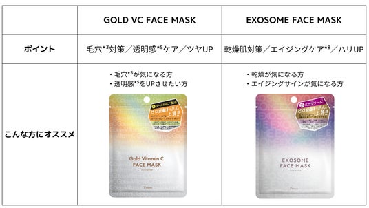 透明感*⁵を高めたい日は「ゴールドVC*²マスク」、乾燥が気になる日は「エクソソーム*¹マスク」と、肌の調子に合わせてお選びいただけます。2種類のフェイスマスクで、ご自宅で簡単にスペシャルケアが叶います。