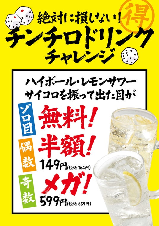 サイコロを出た目でドリンクの量が決定!ゾロ目は半額、合計が奇数ならドリンク倍量!