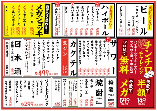 料理は299円~、生ビールは399円、ハイボール&サワーは299円~と、たっぷり食べて、たくさん飲める安心価格でご提供しております。