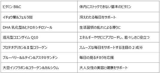 基本のビタミンのほか、還元型コエンザイムQ10など、積極的に摂りたい成分が摂れ、これからの軽やかな毎日をサポート。変化にとまどうときにも必要な栄養が手軽に摂れます。1回分がワンパックにまとまっているので、持ち運びにも便利です。