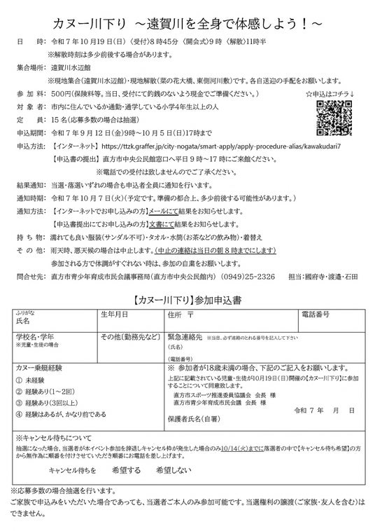 直方市青少年育成市民会議では、直方市スポーツ推進委員協議会と共催で、地域の自然に親しみながら子どもたちの健全育成を図ることを目的に、「遠賀川カヌー川下り」を開催いたします。
