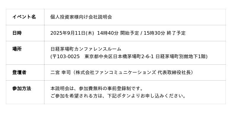 ファンコミュニケーションズ、日本証券アナリスト協会主催「個人投資家様向け会社説明会」開催のお知らせ