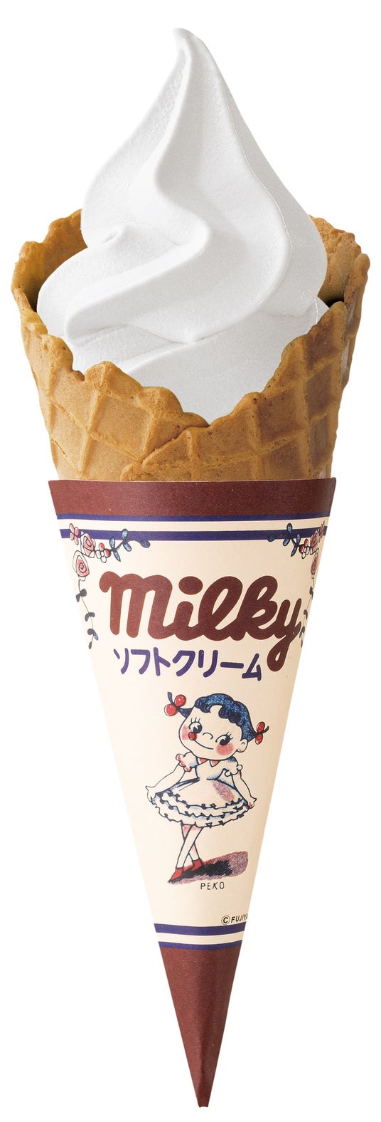 一部の不二家洋菓子店のみで販売中の「milkyソフトクリーム」よりも生クリームの量を増やし、さらに濃厚な味わいに仕上げました。