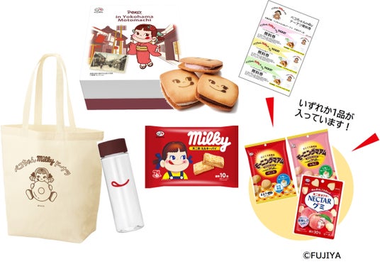 「ペコちゃんmilkyドーナツ」ロゴが入ったオリジナルのトートバッグに、不二家のお菓子やグッズを詰め合わせました。お得なドーナツクーポン付きです。