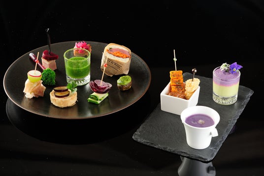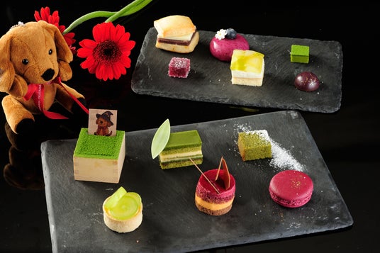 今回のテーマカラーは「紫×緑」。葡萄や紫芋、抹茶をはじめ、寿永3年の創業より愛されている岡山の銘菓「藤戸まんぢゅう」のあんこを使用したスイーツとセイボリーが彩り豊かに並びます。みずみずしい葡萄が層をなすパフェや、ホテルグランヴィア岡山のマスコット「晴太 -HARETA-」がペイントされたチョコレートを添えたガトーショコラも登場し、大人可愛い仕上がりに。秋の味覚を取り揃えたアフタヌーンティーで優雅な午後のひとときを。