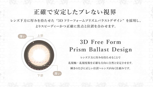 1.正確で安定したブレない視界 "3Dフリーフォームプリズムバラストデザイン"採用レンズの下方に厚みを持たせ、上部は薄く整えることで、乱視軸・乱視度数を正確な方向に自然と安定させます。瞬きの度に、正しい位置にレンズが向く仕組みで、よりスピーディーかつ正確に焦点と位置を合わせます。
