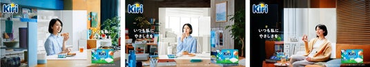 心地よいクリーミーな食感と、口にした瞬間に広がるシンプルなしあわせ感が特長の「キリ」は、日常のどんなシーンにもマッチします。新しいTVCMでは、忙しい朝のトーストに、ランチのお弁当に添える美味しいカルシウム補給として、そして夕食後のリラックスタイムにはクラッカーに乗せるだけで完成するおつまみとして、手軽な楽しみ方を紹介。さらに、そのまま食べても、身近な食材と組み合わせても美味しく召し上がれる「キリ」の万能さを表現しています。