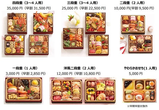 ご家族で年始を迎えられる方に向けた「四段重」「三段重」だけなく、単身世帯の方に向けた「一段重」、硬いものが食べにくくなった方でもおいしくお召し上がりいただける「やわらかおせち」など、幅広いラインアップが特徴です。