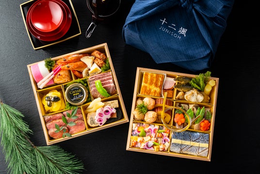 「十二颯」を統括する料理長 青柳 源太が手掛ける伝統的なおせち料理は「数の子」や「栗きんとん」、ふっくらと炊いた「黒豆」などの定番おせち料理に加え、丁寧に出汁をとり長時間かけて柔らかく炊きあげた「子持ち鮎煮浸し」、冷めても美味しくいただける「ふぐの唐揚げ」や「炙り合鴨ロース」などをご用意しています。