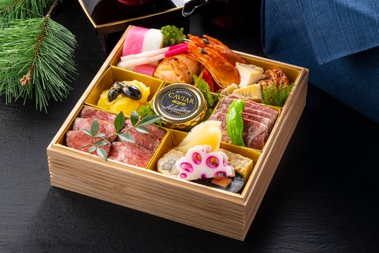 日本料理「十二颯」 会席、寿司、鉄板焼3名の料理長によるコラボレーションおせち。キャビアや神戸牛ローストビーフも新登場。