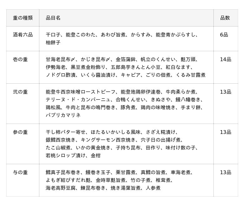 能登の食文化や里山里海の恵みを彩り華やかに盛り込んだ、「味覚の宝庫能登」の贅を尽くした加賀屋ならではの祝い膳です。