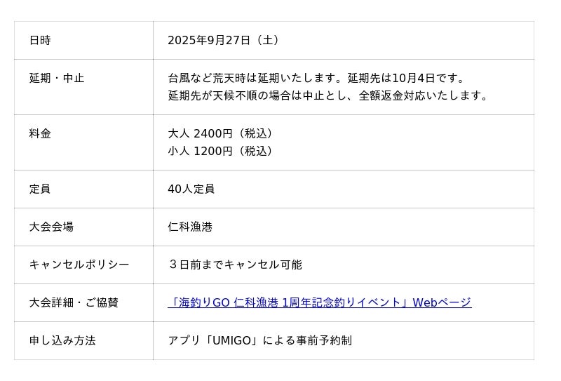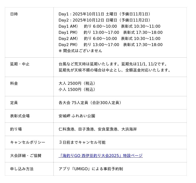 株式会社ウミゴー(静岡県賀茂郡西伊豆町、代表取締役:國村大喜)と日本さかな専門学校(神奈川県三浦市、学校長:松山英一)が中心となり、西伊豆エリアを舞台に、日本さかな専門学校生が企画・運営を手がける4大会連続の釣りイベント「海釣りGO 西伊豆釣り大会 2025」を10月11日と12日の2日間(予備日は11月1日、2日)開催いたします。学生が自らプロデュースする各大会はそれぞれ異なるテーマとルールで構成され、参加者の皆さまに新たな釣りの魅力を体験していただけます。また、株式会社ウミゴーは西伊豆町仁科漁港への海釣りGO導入1周年を記念して、「海釣りGO 仁科漁港 1周年記念釣りイベント」を9月27日(予備日は10月4日)に開催いたします。