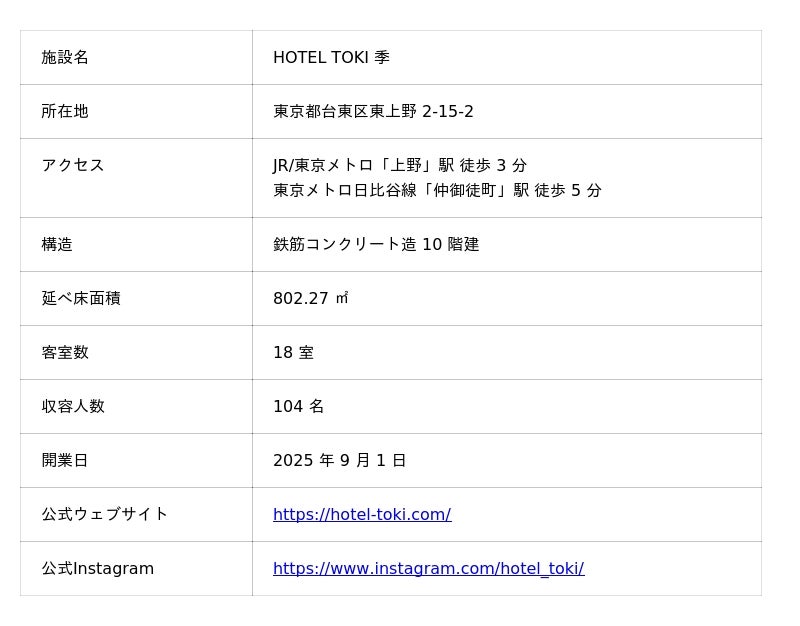 カソク株式会社(本社:東京都新宿区、代表取締役:新井恵介、以下「当社」)は、生和グループ(https://www.seiwa-stss.jp/)が開発・設計施工し、所有するレジデンシャルホテル「HOTEL TOKI 季」(所在地:東京都台東区東上野 2-15-2)を、2025 年 9 月 1 日、東京都台東区東上野において、開業いたしました。