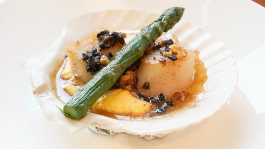 北海道産ホタテ貝のポワレ トリュフと胡桃のノワゼット アスパラのロティ添え