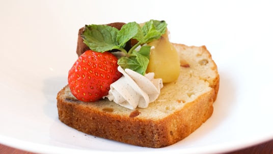 - ラム酒に漬けた北海道産小麦のドライフルーツパウンドケーキ 生チョコレートと栗のグラッセ添え(1,300円)