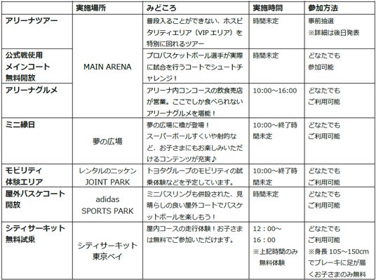 なお、施設近隣にある「シティサーキット東京ベイ」、「夢の広場」などでも、ARENA DAYに合わせたイベントを実施予定です。