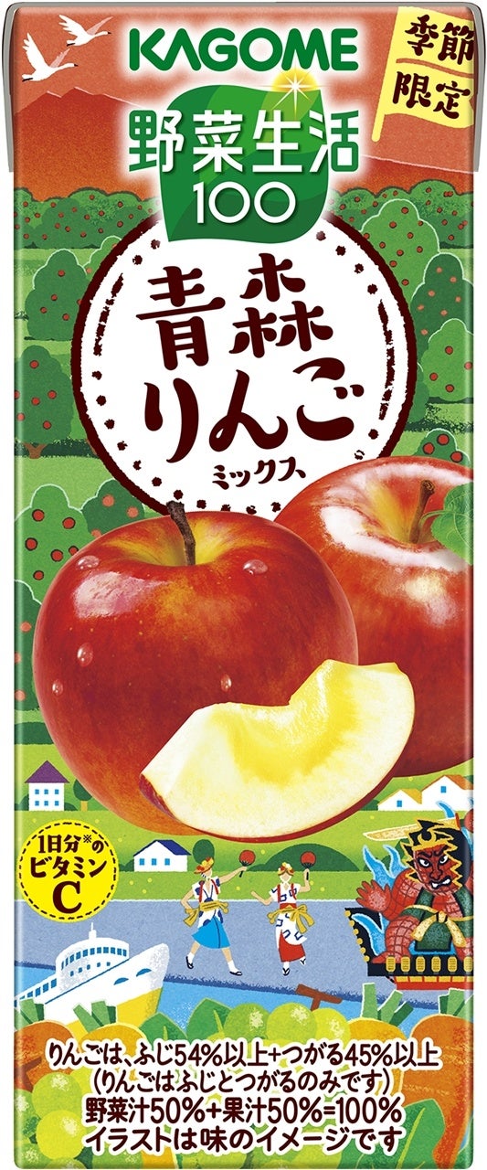 今回は、昼夜の寒暖差が大きく、甘くて美味しい果実が育つ青森県に着目しました。夏でも涼しく、暑さに弱いりんごの木の栽培にも適した土地です。このたび発売する「野菜生活100 青森りんごミックス」は、20種の野菜と3種の果実を使用し、甘くて美味しい青森県産りんごの味わいの野菜&果実100%ジュースです。朝食のおともや、リフレッシュしたいときにおすすめです。
