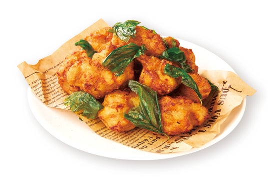 【商品名】スパイス香るイタリアンチキン バジルフリット添え【商品説明】ジューシーな鶏のもも肉をサクっと揚げたイタリアンチキンに、ほんのりウーシャンフェンの香りとバジルのフリットの食感と爽やかな風味がアクセント。