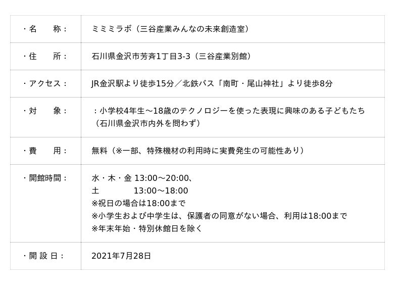 三谷産業とテクノロジー教育の普及を目指すみんなのコードが、2021年7月、石川県金沢市に開設した施設です。プログラミングできるロボットや3Dプリンタ、グラフィックや映像、楽曲制作ができるソフトなどを揃えています。小学校4年生~18歳の子どもたちが無料で、最新のテクノロジーを通して創造的な活動に取り組むことができる第三の居場所として運営しています。さまざまな得意分野を持つ大学生や社会人のメンター常駐し、自分の好きなことにチャレンジする子どもたちの背中を後押ししています。