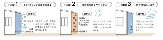 TOTOの光触媒技術「ハイドロテクト」とタイルを組み合わせた一条の超高性能タイルです。一般的なサイディング外壁やタイル外壁では経年による汚れが落ちにくくなりますが、ハイドロテクトタイルは、太陽の光で汚れを分解して雨で洗い流す「セルフクリーニング効果」により、いつまでもキレイな状態が続きます。