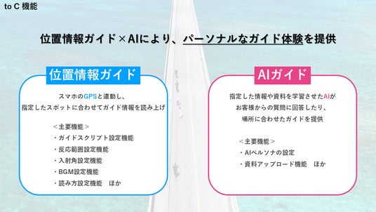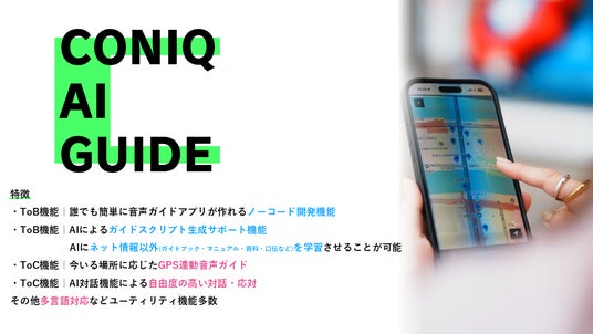 本イベントで提供した「CONIQ AI GUIDE(仮称)」は、トヨタ・コニック・プロとAtlas株式会社(本社:東京都渋谷区、代表取締役社長:宮崎 悠生)が共同で開発を進めています。スマートフォン端末の位置情報と連携した音声ガイドと、特定エリアの情報を学習させ、そのエリアに特化したAIによる質問回答などコンシェルジュ機能の提供が可能です。また、事業者自身でコンテンツを作成することが可能なダッシュボード機能(管理画面機能)も実装しており、低コストでの観光コンテンツ制作が可能です。