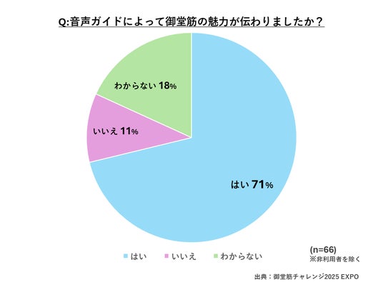 また、AI音声ガイド利用者のうち71%の方が「音声ガイドにより御堂筋を魅力的に感じた」と回答。AI音声ガイドはエリアの魅力度向上に一定の効果があることが確認できました。