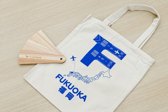さらに、香港行きCX589便の搭乗ゲートでは、ご搭乗のお客様全員に記念品(キャセイ オリジナル木製扇子、福岡国際空港 オリジナルトートバッグ)をプレゼントいたしました。