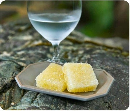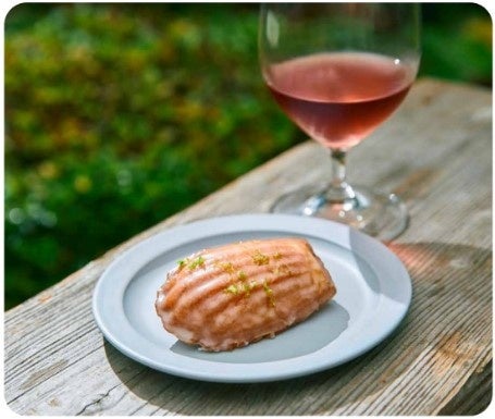 赤米から造る日本酒は、まるでベリーのような甘い香りと味わい。グリーンレモンの爽やかな酸味がよく合います。しっとりとしたマドレーヌにレモン果汁入りの砂糖をまとわせシャリシャリとした食感に。