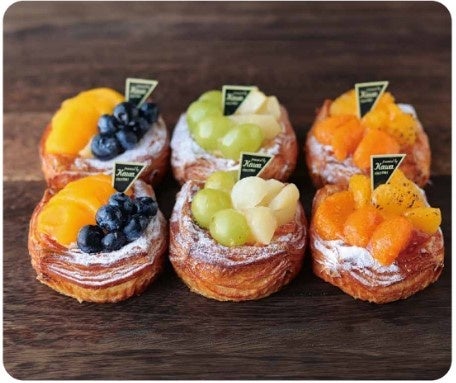 『和歌山の魅力を詰め込んで、いろんな味が楽しめたら』という思いがデニッシュになりました。アーモンドクッキー生地を絞り焼いたサクサク生地に、自家製カスタードクリーム、主役は、和歌山県産の果実をたっぷり。