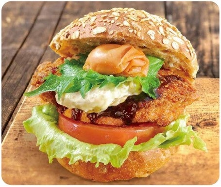 蜜漬けの紀州南高梅とサクサク自家製チキンカツ&梅の特製Wソースがクセになるバーガー。