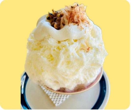 鰹節の発祥地、印南町をアピールするべく、鰹節のかき氷をご用意。出汁のエスプーマ、鰹節、はちみつ梅、ウツボの揚げ煮をトッピングした、ほかにはない味わいをぜひ!