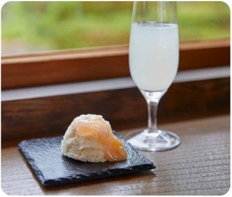 紀土 純米大吟醸は、初めての方でも華やかで飲みやすい日本酒。甘口の代表ともいえるこのお酒と合わせるのは、はっさくの果汁をそのまま閉じ込めた少し苦みを感じるパート・ド・フリュイです。