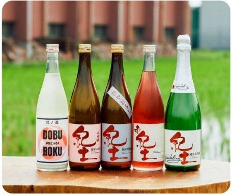 左から)平和どぶろく弐ノ濁(720ml)1,760円 紀土 純米大吟醸(720ml)1,540円 紀土 純米吟醸 ひやおろし(720ml)1,375円 赤紀土(720ml)1,650円 紀土 純米大吟醸 Sparkling(720ml)2,310円、(360ml)1,210円