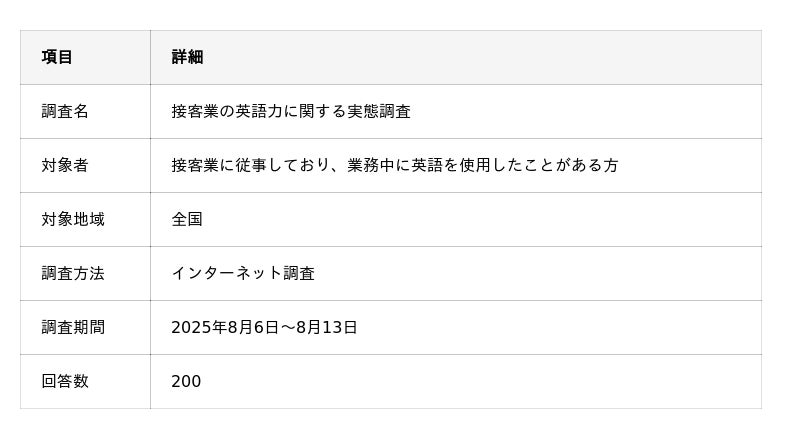 本調査では、「接客業に従事し業務中に英語を使用した経験がある方」200名を対象に、英語スキルの自己評価、使用場面や頻度、困難の内容、職場での支援体制、さらには英語力向上のために有効と感じた学習手段や求められるサポートについて調査を行った。