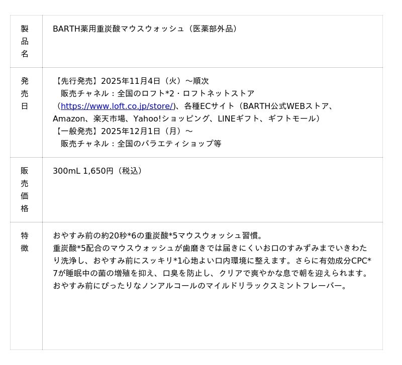 バスタイムからスリープタイムまでワンランク上のナイトルーティンを提案するナイトウェルネスブランド「BARTH(バース)」は、おやすみ前にすっきり*¹と心地よい口内環境に整えるオーラルケアアイテム『BARTH薬用重炭酸マウスウォッシュ』を2025年12月1日(月)に発売します。